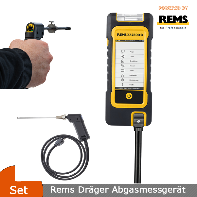 Abgasmessgerät Dräger FG7500, Steckernetzteil, USB-Kabel, Abgassonde, Brennerdrückschlauch, Verbrauchsmaterial Set FG7500, Bluetooth LE, Software, Koffer.